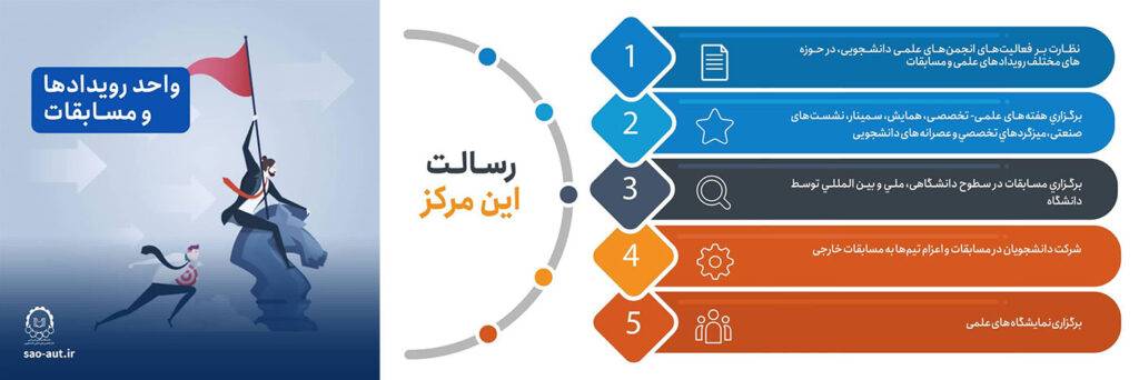 با توجه به اهمیت و تاثیر مسابقات و رویدادهای علمی در شناساندن و ارتقاء جایگاه علمی دانشگاه در سطوح مختلف ملی و بین المللی، این واحد در سال ۱۳۹۵ از واحد آموزش و فوق برنامه جدا شد تا بطور مستقل و مجزا بر هر چه بهتر و کامل تر انجام شدن این امور نظارت شود. از جمله وظایف این واحد می توان به موارد زیر اشاره کرد: